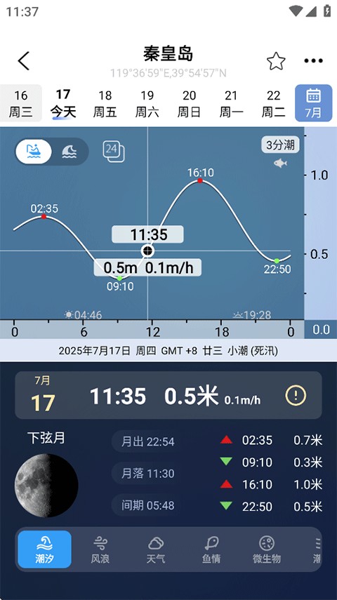 实时显示当前及未来潮汐曲线、浪高和月相信息。