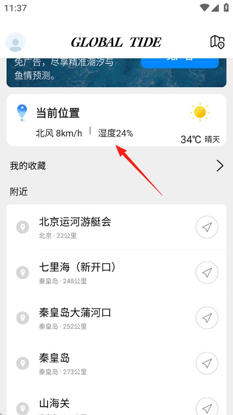1、打开全球潮汐APP,在首页先定位你所在的位置或想要了解的位置。