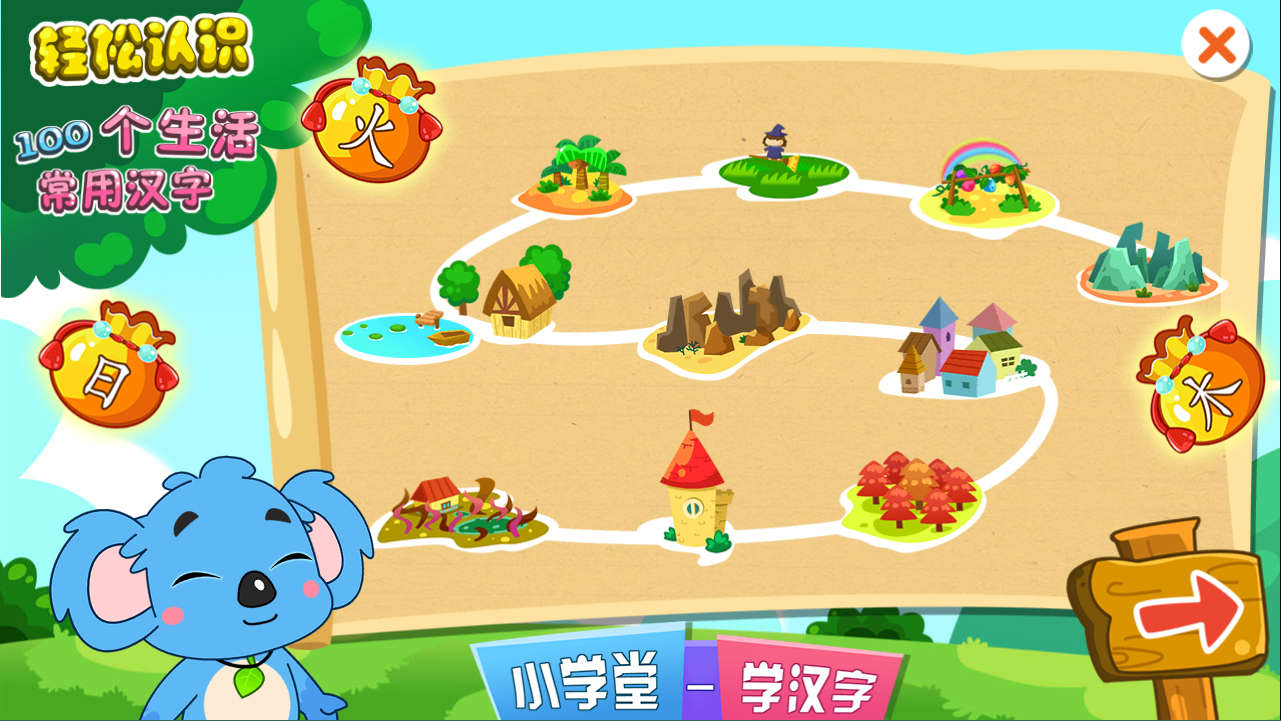 1、进入儿童宝宝学汉字手机版后,在主页面点击右下角的箭头